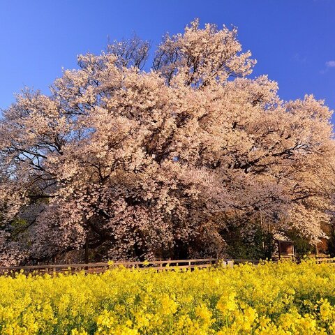 This is a 400-year-old giant wild cherry tree, 14m tall, surrounded by rape blossoms in Minamiaso...