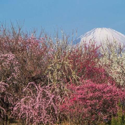 Picture postcard photos taken at the Soga (Bessho) plum grove - a beautiful combination with Mt. Fuji