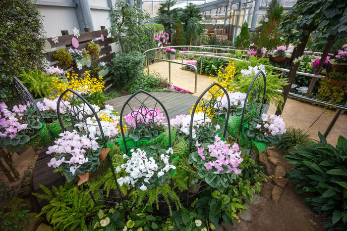 In mid-March, the cyclamens in the glasshouse will be replaced with cineraria, a spring flower.
