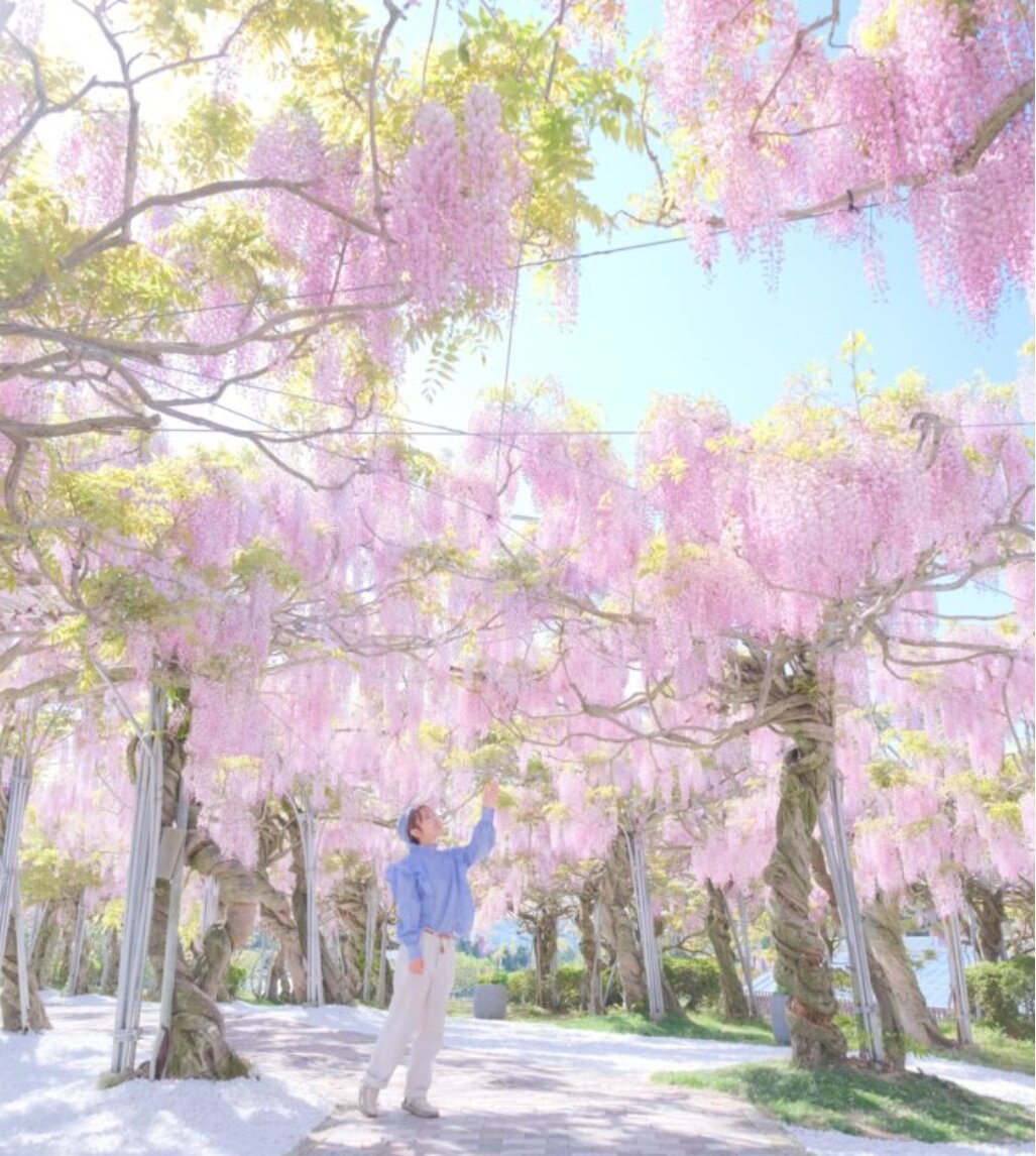 3haの敷地に約1,000本の藤と、ルピナス12,000株が花開きます。「藤枯山水」「十二単絵巻」「昇り藤の谷」などテーマごとのスポットがあり、様々な視点から藤の魅力を感じることが出来ます。
