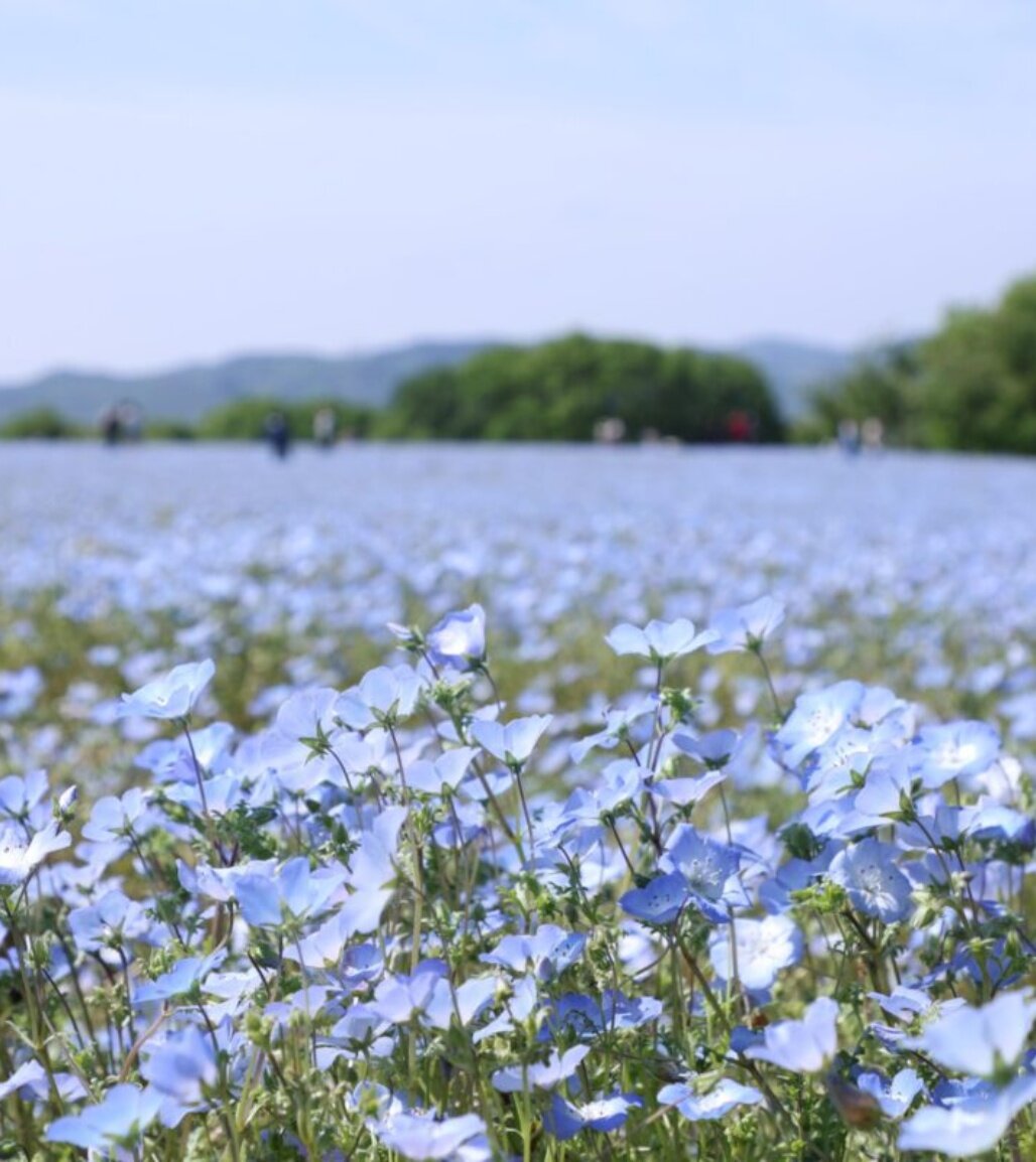 広い空と山々を望む世羅高原の雄大なロケーションのもと、春は芝桜とネモフィラの丘一面が色鮮やかに彩られます。