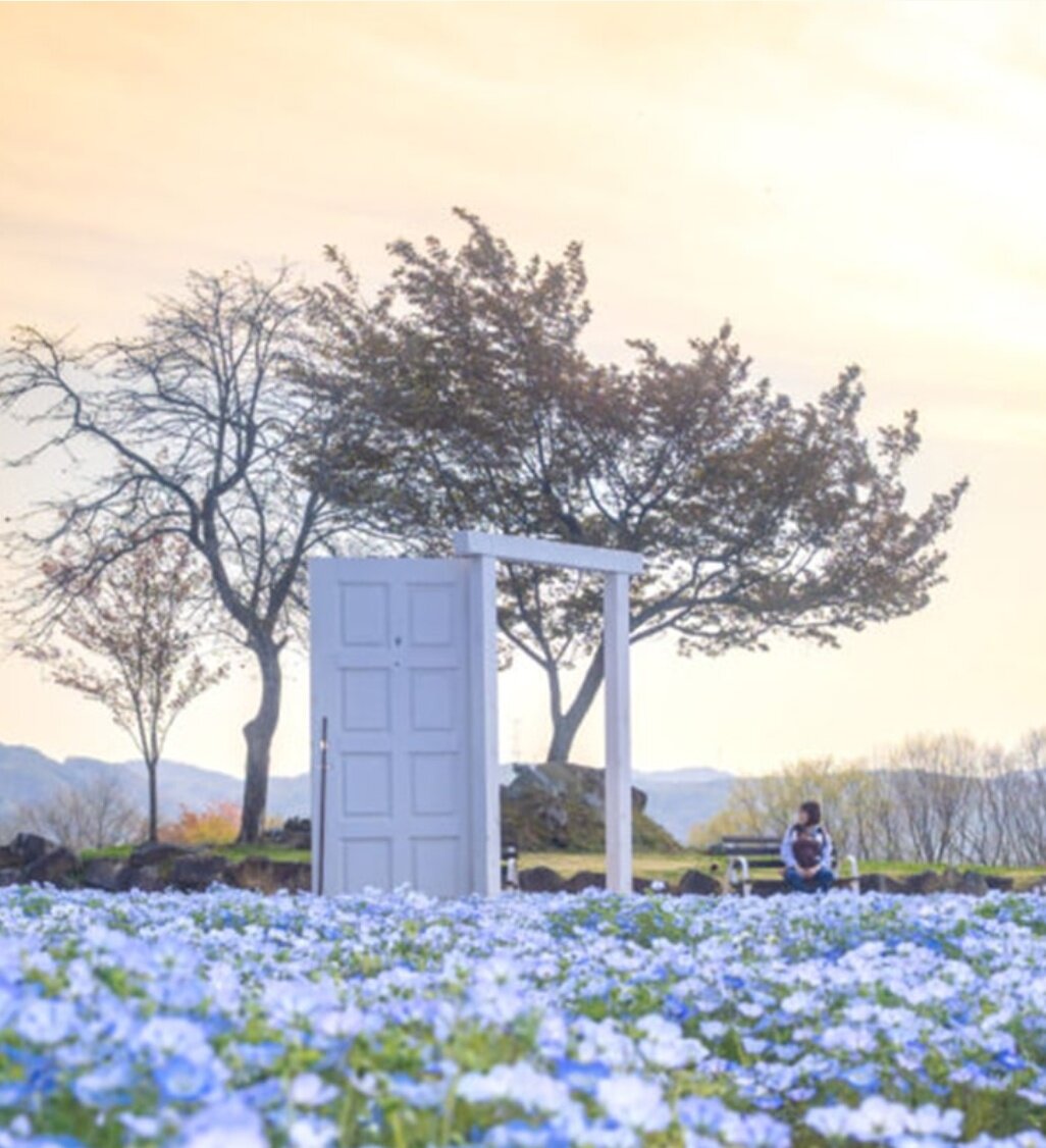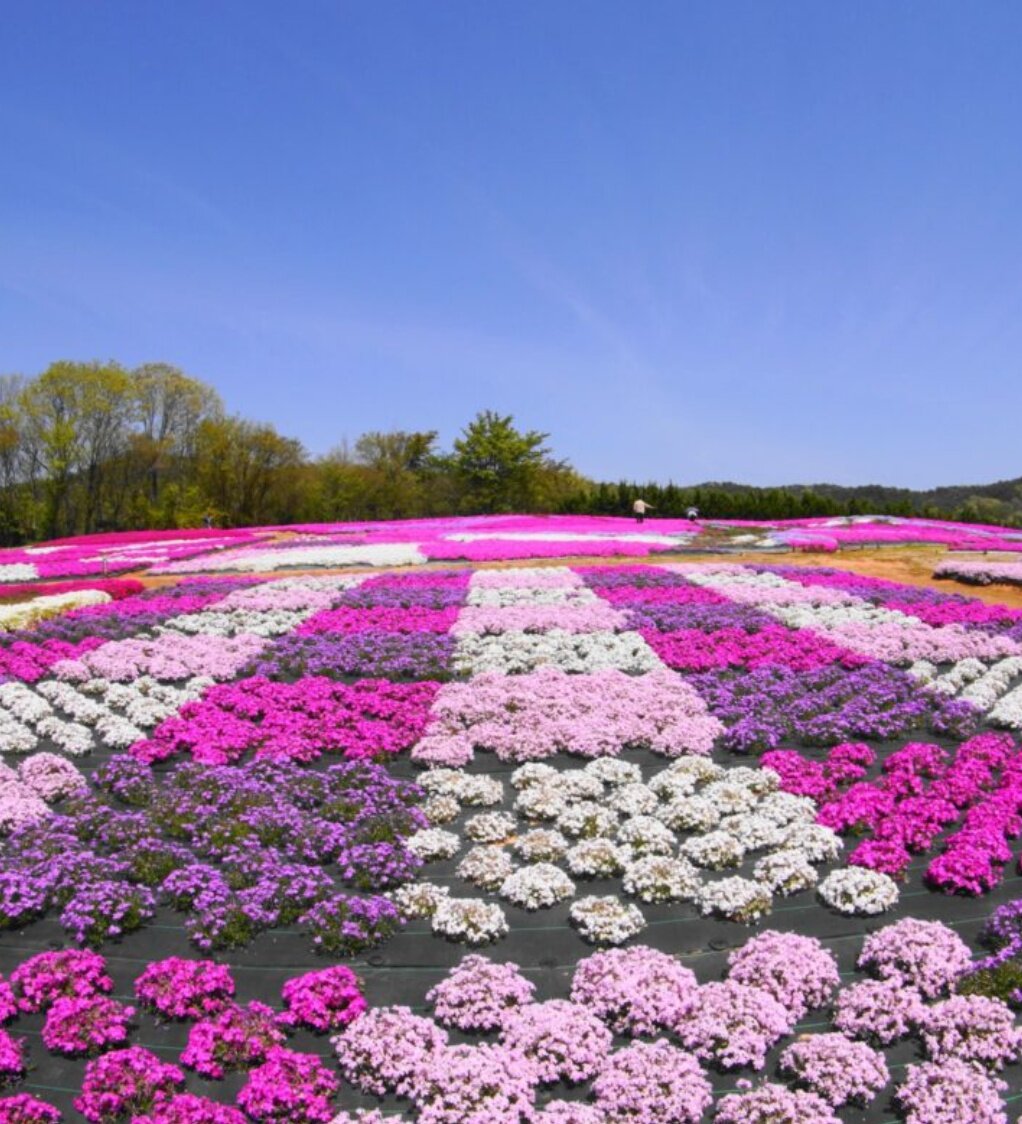 西日本最大級40,000?の丘に45万株の芝桜と100万本のネモフィラが広がるピンクとブルーの花の世界。丘一面を覆いつくす花々が春風にゆられ、ときめきをあなたへ運びます。