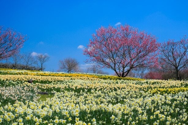 ・スイセンガーデン・うめ園【みのりの里】 日本最大規模150万本・700品種のスイセンが咲き誇り、備北丘陵公園にしかない品種もあります。うめの花や希少種のササユリも咲きます。