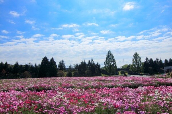 ・「花の広場」 約1.5ヘクタールの広場が、春はチューリップ・秋はコスモスの花畑になります。「はなの展望台」で上から花畑全体を眺めることもできます。