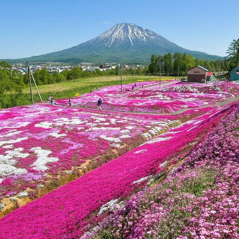 羊蹄山の北、倶知安町(くっちゃんちょう)の個人のお庭です。4,000?に芝桜が咲きます。周囲は菜の花が...
