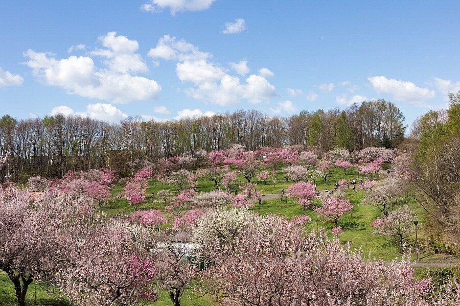 公園内の梅林に約1500本の梅が植えられた、札幌市内の人気スポットです。起伏のある地形であるために、芝生の緑に梅の色が映えます。