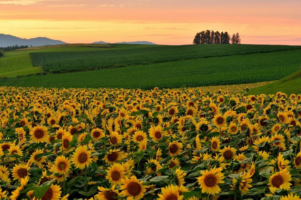 ひまわり畑を丘から眺めることができ、夕焼けとのコラボレーションは美しいです。