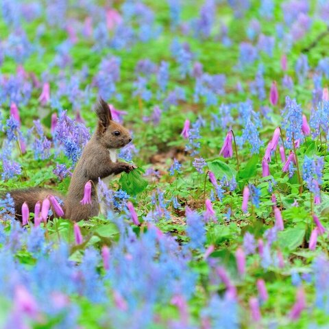 カタクリとエゾエンゴサクの小さなお花畑で遊ぶエゾリスが人気です。