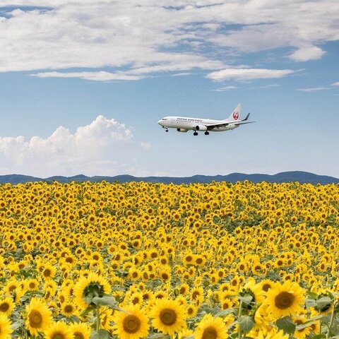 ひまわり畑の上を飛ぶ飛行機の写真を撮影できる、人気のスポットです。