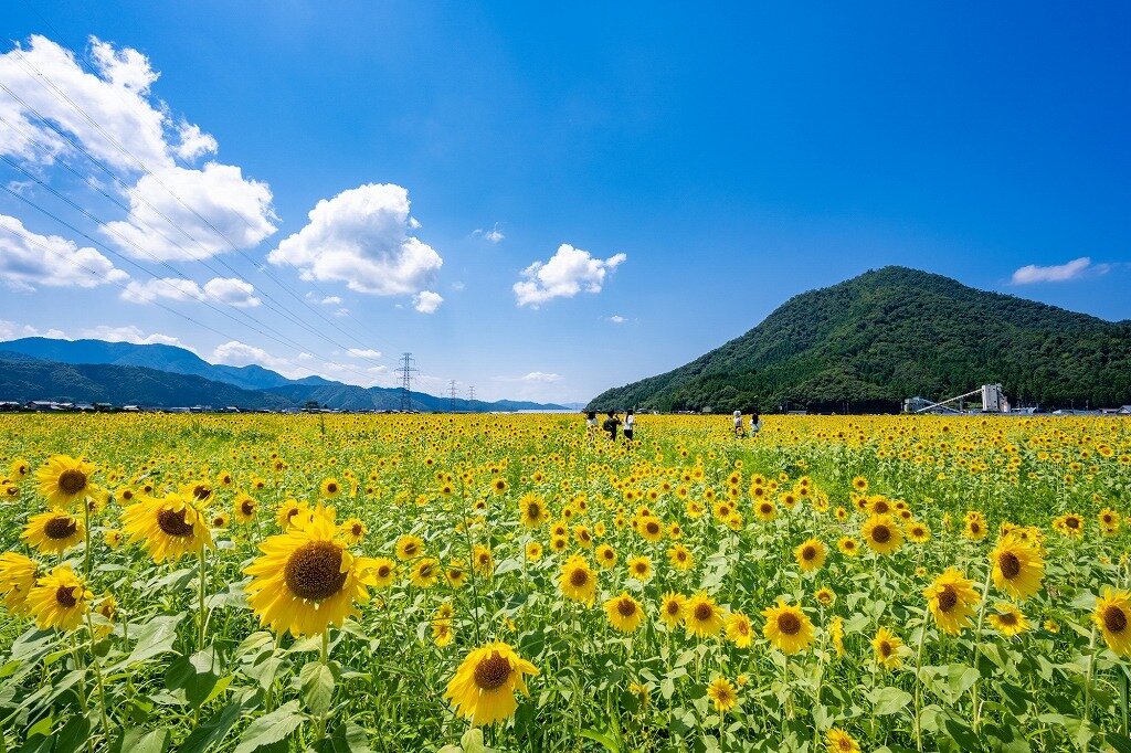 7月から8月中旬まで、広大な畑に広がるひまわりの迫力満点の景色が小高い山をバックに楽しめます。