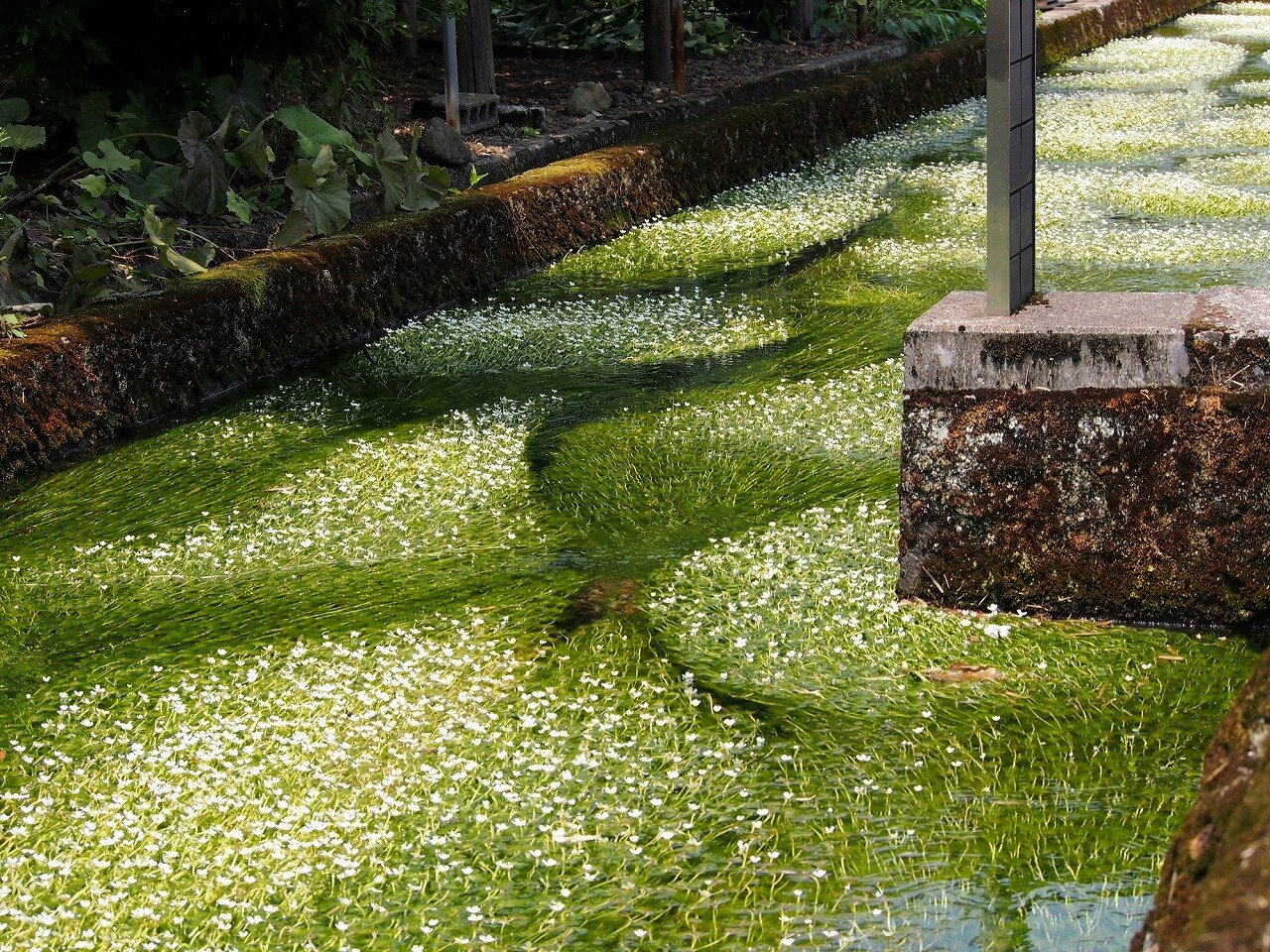 越前市上真柄町(かみまからちょう)を流れる小川です。清水にしか棲めない淡水魚、トミヨが棲息する清流で、梅花藻が群生しています。夏に白い花が咲きます。治左川上流には湧き水を汲み上げている治左川井戸があり、容器に汲み帰る人もおみえになります。