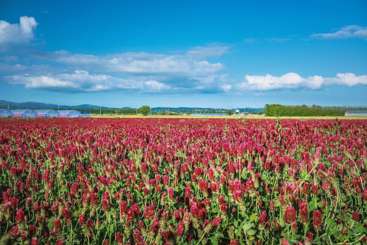 河北潟は、金沢市北部にある潟湖(せきこ)です。河北潟干拓地、津幡町(つばたまち)では、ひまわり畑の連作障害対策にクリムソンクローバーを植えています。