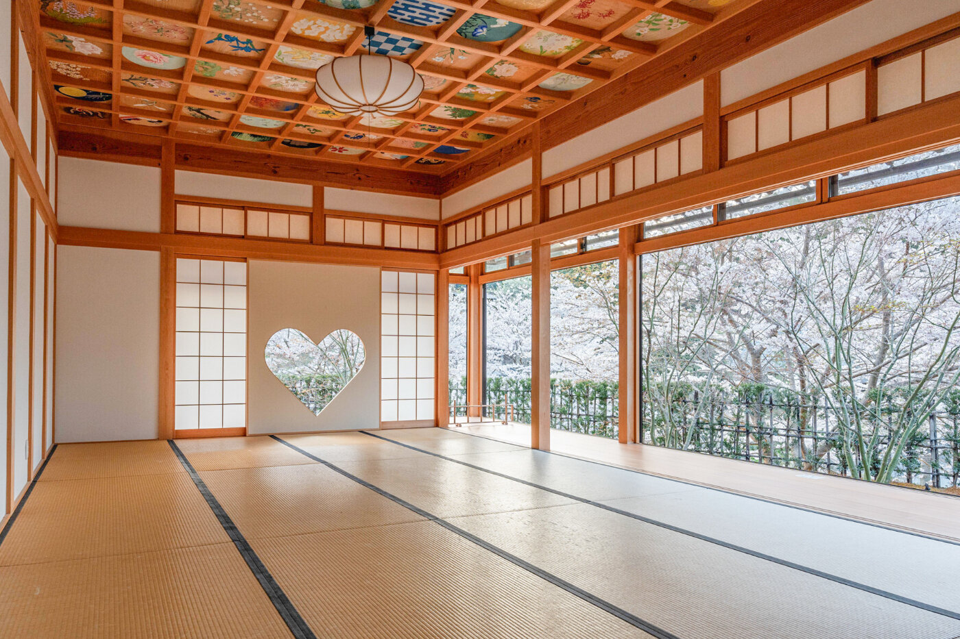 創建800年の古刹の春は、樹齢100年の桜や本堂と客殿の周囲に植えられた桜が咲き誇ります。客殿からは目線の高さに広がる桜の海を楽しみ、日本伝統文様のひとつであるハート形の猪目窓からは桜色に染まったおしゃれな景色を楽しむことができます。昼間とは違った雰囲気のお花見を楽しめるライトアップイベント「観桜会」では水鏡のようにリフレクションした桜もおすすめです。