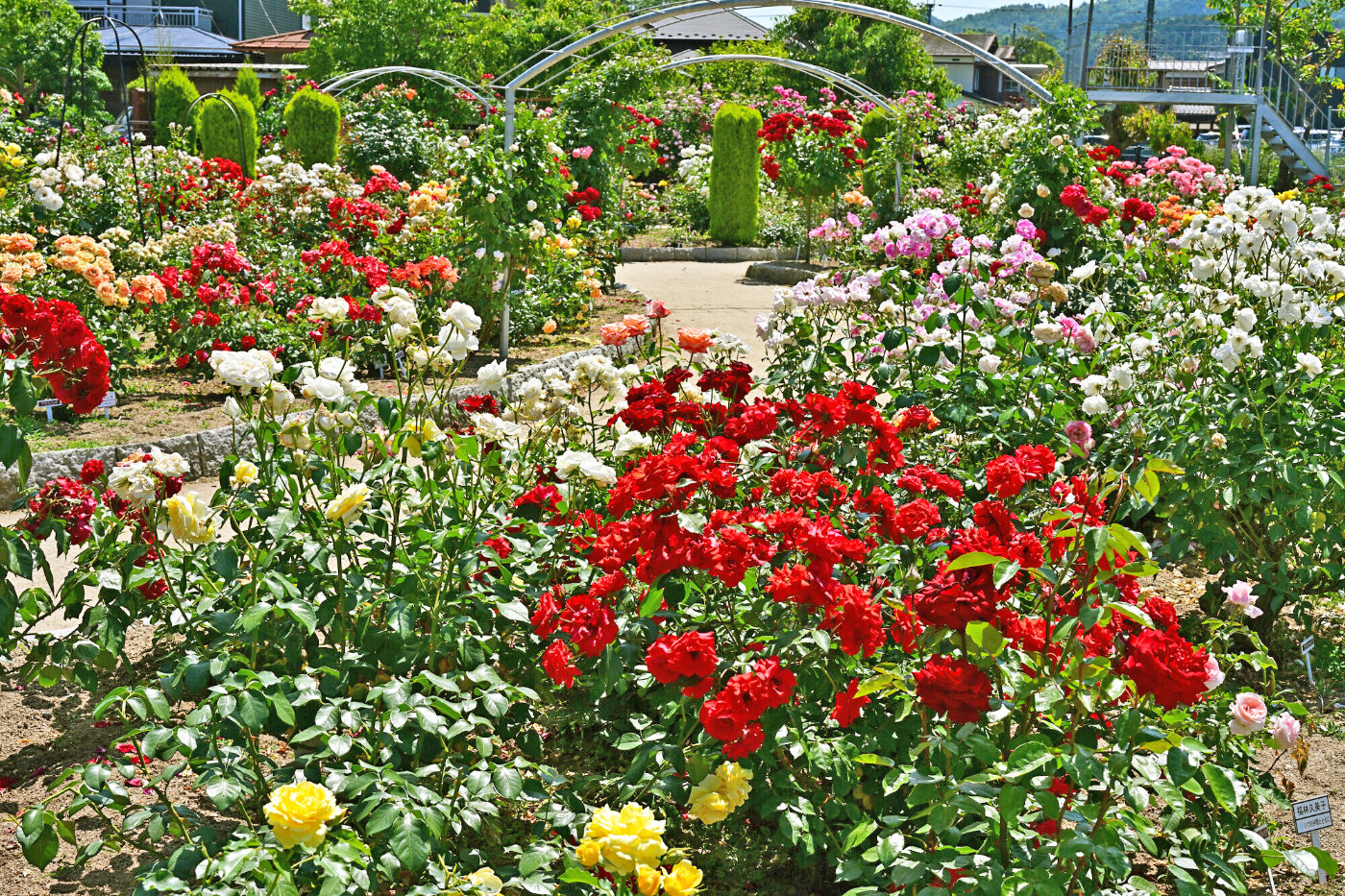 綾部バラ園は都市交流拠点エリアの『あやべグンゼスクエア』にあり、約170品種1,200 本のバラが咲き競うバラの名所です。5月下旬から6月下旬まで「春のバラまつり」、10月中旬から11月中旬まで「秋のバラまつり」が開催され、季節ごとに美しいバラを楽しめるスポットとして知られています。こちらは市民ボランティアにより維持管理されているバラ園で、そのシンボルである「アンネのバラ」は、『アンネの日記』の作者アンネ・フランクの父オットー氏から日本へ送られてきた苗木を基に株を増やされたということです。