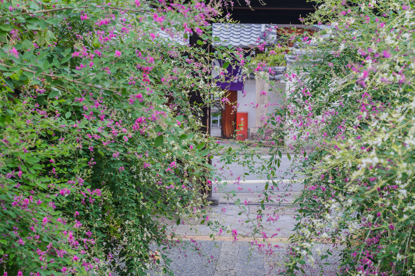 勝念寺(しょうねんじ)は、京都府京都市にある寺院で萩の花が有名です。毎年9月頃に開催されている「?萩振る舞い」の時期には、境内に赤紫・白・ピンクの萩の花が咲き誇り、多くの参拝者や写真愛好家が訪れます。主な品種は枝の荒れる錦萩の系統となり、風に揺れる様子が詩情を感じさせます。また境内で安置されている釜敷地蔵尊から「かましきさん」として江戸時代より信仰を集めています。