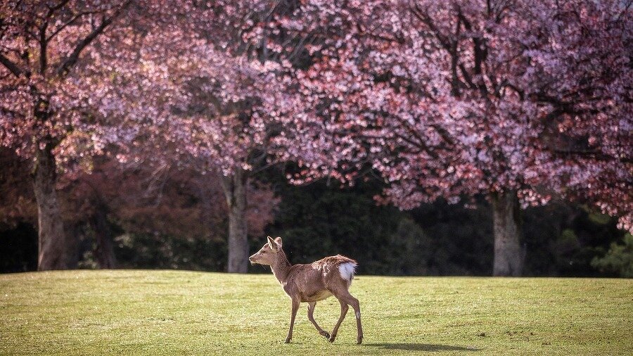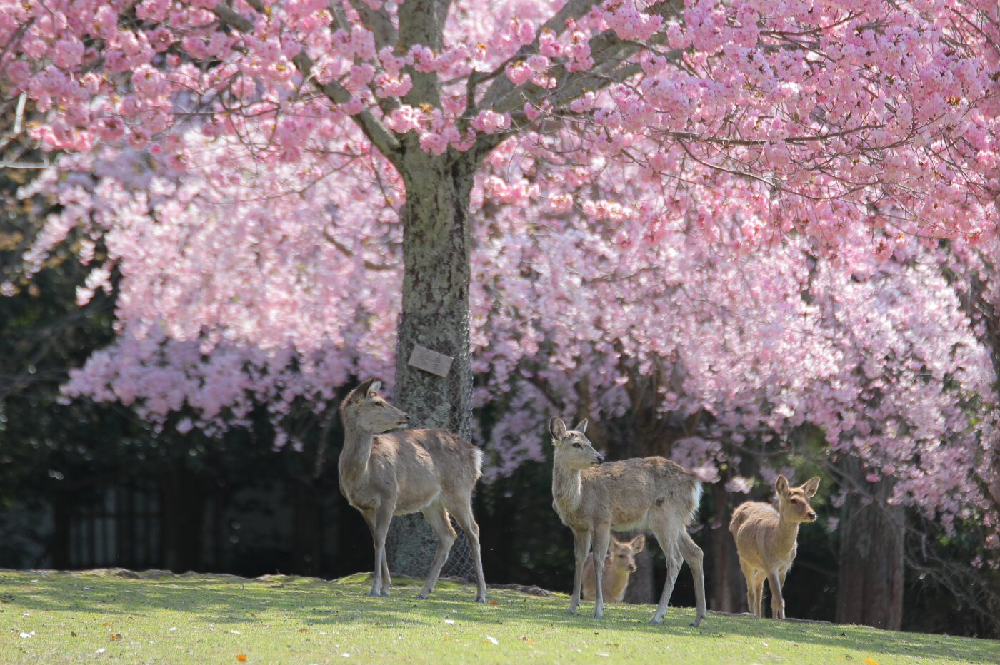 奈良県の県花である奈良八重桜が公園の隋所で見ることができます。桜の下で鹿たちがお花見する光景も奈良公園ならでは。