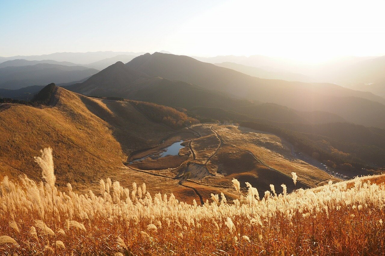 三百名山倶留尊山から南の亀山に続く稜線を背にした高原です。ススキが一面を覆い、秋は銀色に輝きます。夕方から遊歩道に山灯りが灯されます。