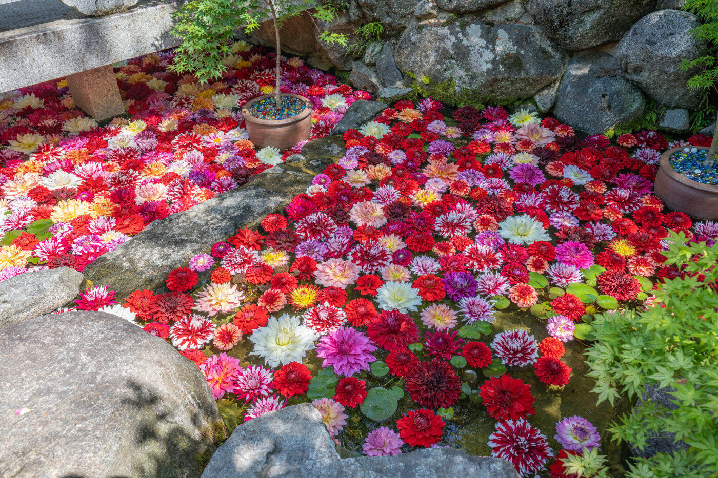 石楠花は境内に3,000株、牡丹の花も数百株あります。仁王門を入ってすぐの池や手水舎や鉢に天竺牡丹(ダリア)を浮かべる華の池~水面に浮かぶ天竺牡丹をG.W期間中に実施しています。