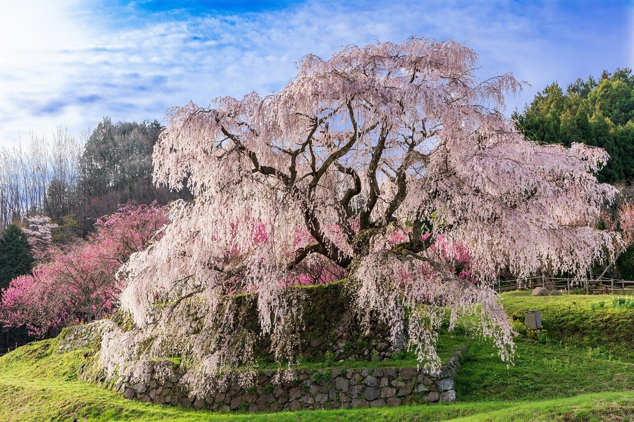 宇陀市にある樹齢300年、樹高13mのシダレザクラです。戦国武将、後藤又兵衛がこの地に落ちのび、後藤家の屋敷の桜です。後ろに桃の花も咲きます。