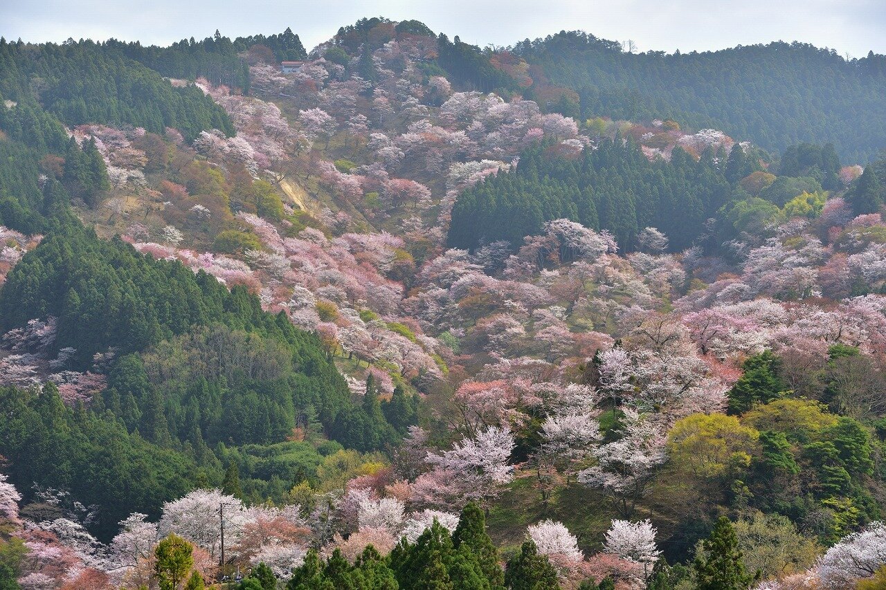 吉野川から大峰山脈に続く尾根続きの山域です。金峯山寺(きんぷせんじ)などの寺社があります。古くからの桜の名所です。地域ごとに下千本、中千本、上千本、奥千本と呼ばれています。ほとんどが白山桜(シロヤマザクラ)で、3万本といわれています。