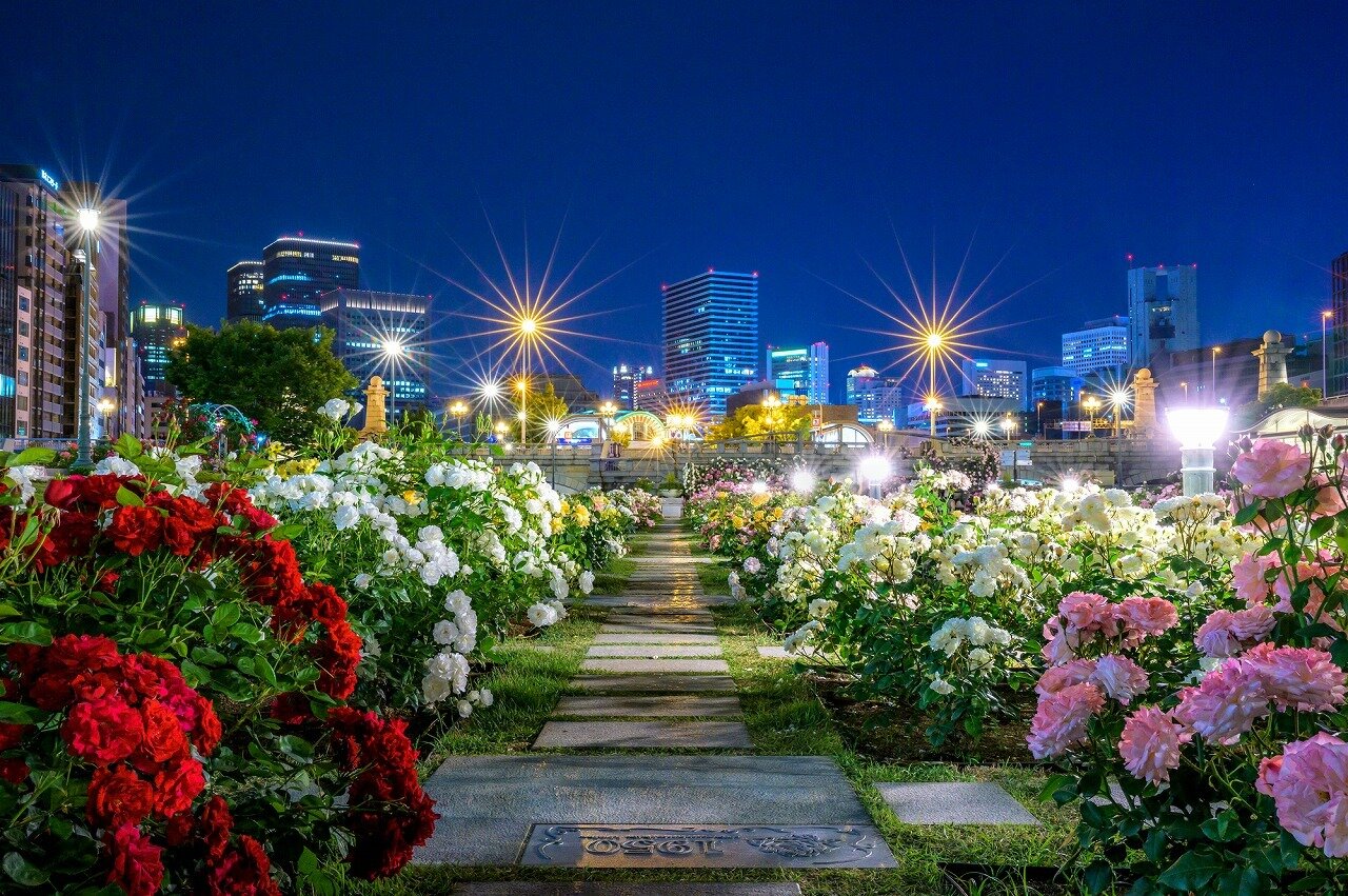 中之島公園は、大阪市の中心部を流れる堂島川と土佐堀川に挟まれた中州に位置し、都会のオアシスとして安らぎを得られる公園です。その中でも特に有名なのは、310種、3,700株のバラが植えられている中之島バラ園です。5月上旬~5月下旬の春のバラと、10月上旬~10月下旬に見頃を迎える秋のバラはさまざまな色や形、香りを楽しむことができ、訪れる人々を魅了しています。