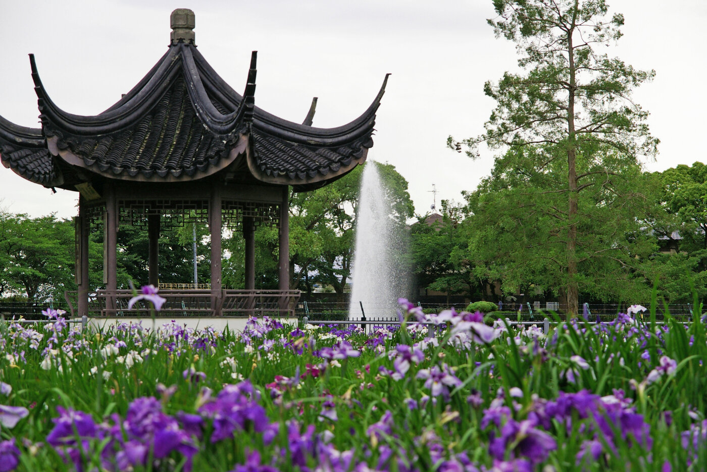 水月公園(すいげつこうえん)は、大阪府池田市にある公園で、友好都市である中国・蘇州市から贈られた特徴的な屋根を持つ斉芳亭があり、中央の池には噴水がある「水の公園」となっています。その園内には梅や花しょうぶが季節を彩る花としての名所となっています。
