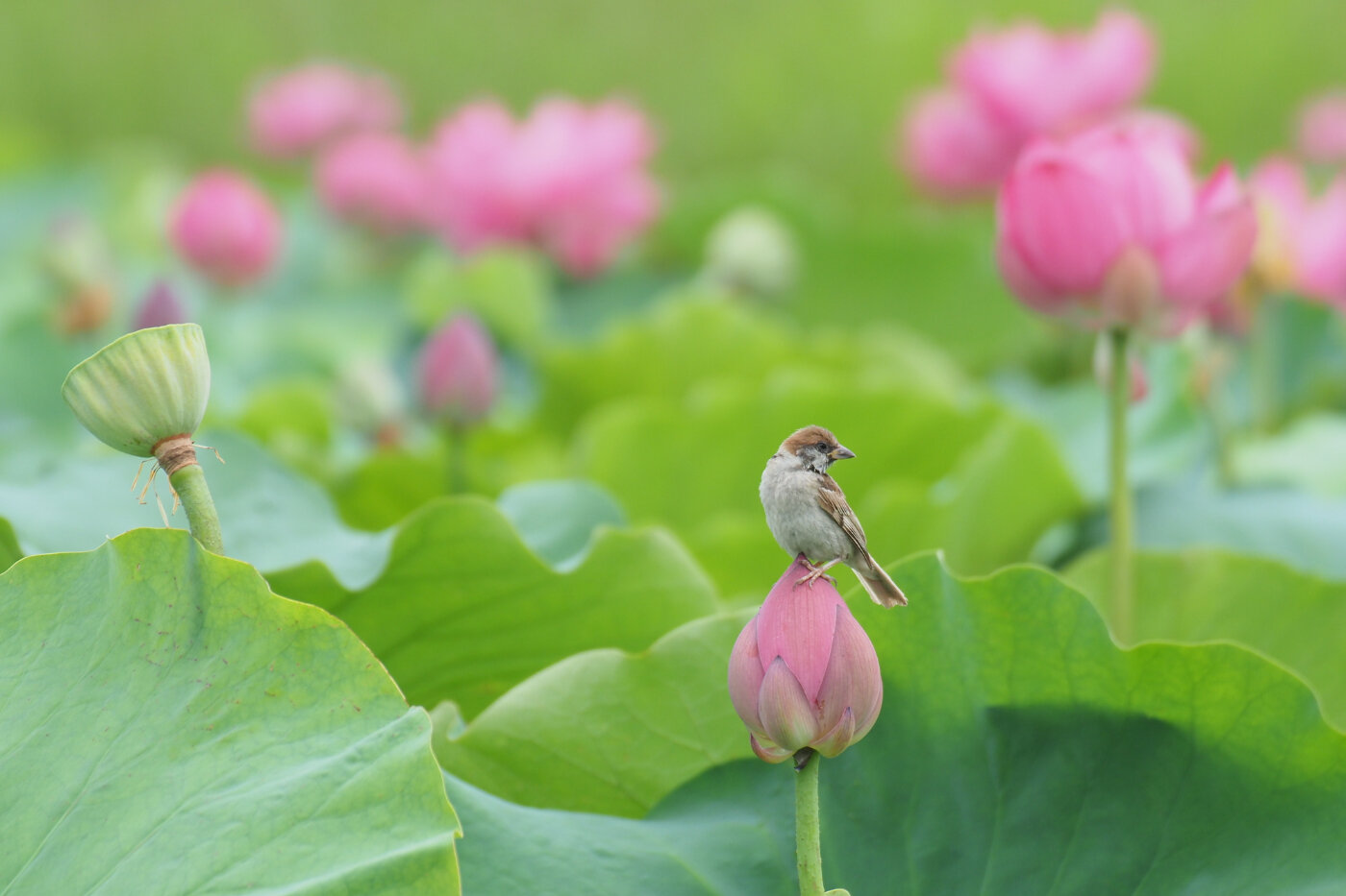 また、6月下旬~8月上旬には池一面に咲く蓮の花々が公園内に圧巻の情景を作り出しており、花に引き寄せられたスズメと蓮のコラボレーションが、カメラマンの人気撮影スポットとしても有名です。