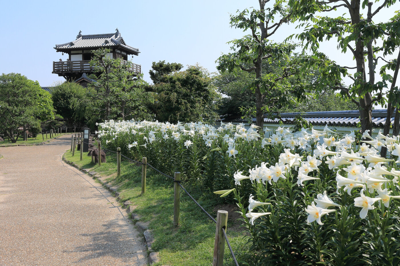 池田城跡公園は、戦国時代に建てられた池田城の跡地に池泉回遊式庭園の公園として整備され、ゆりや花しょうぶなど四季折々の花を楽しむこともでき、訪れる人々を魅了しています。6月にはゆりまつりも開催されお城とのコラボレーションが楽しめます。また園内の売店では「御城印」も販売されています。