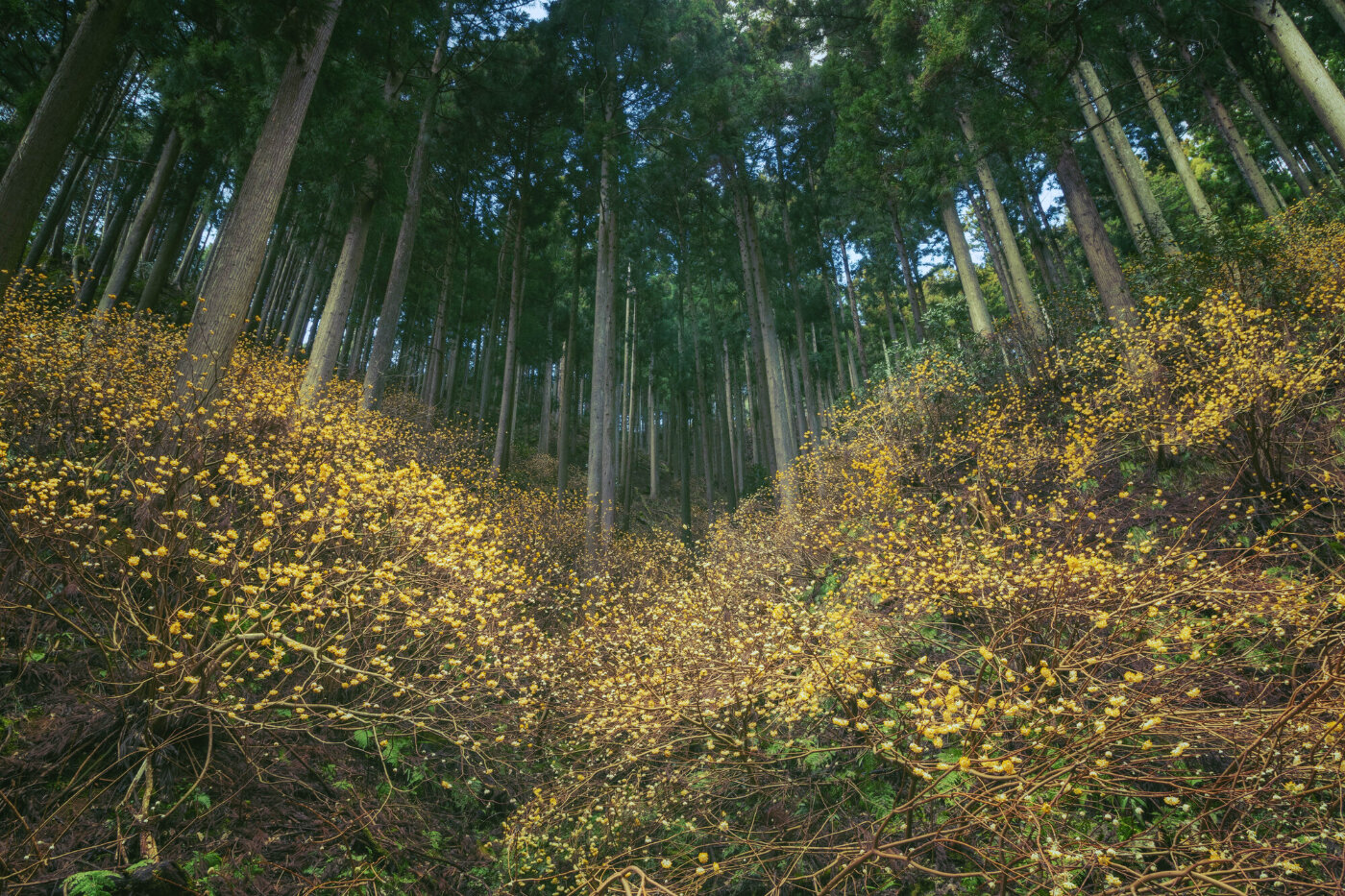 滋賀県内のミツマタ群生地。生育地の間伐により日が入るようになり群落となったと言われています。