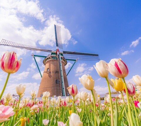 本格的なオランダ風車と花畑(チューリップ、ひまわり、コスモス)が素敵な風景。夕日に染まる時間帯も...