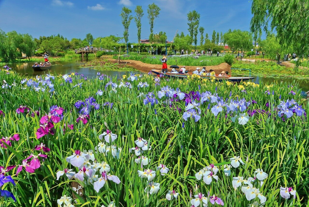 霞ヶ浦の南、香取市、与田浦のほとりにある水生植物園です。フジ、アヤメ、ハナショウブ、ハス、スイレン、リコリスなどが咲きます。ハナショウブは、400種、150万本咲きます。サッパ舟による園内周遊ができます。嫁入り舟のイベントもあります。