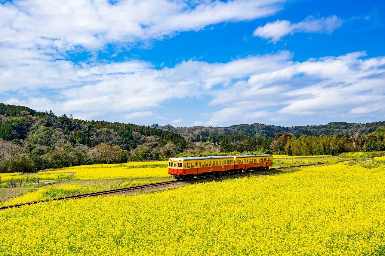 五井(ごい)から、上総中野までを走る鉄道です。養老渓谷駅の近くの石神には、春に菜の花畑、夏にひまわり畑が、秋は線路沿いに彼岸花が広がります。飯給駅(いたぶえき)は、駅前の水田に水が張られ、水鏡になります。桜と列車の撮影スポットとして有名です。蒸気機関車が引っ張るトロッコ列車も走ります。