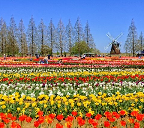 風車が回るロマンチックな花風景。チューリップ、向日葵、コスモスの季節がおすすめです。また、ポピー...