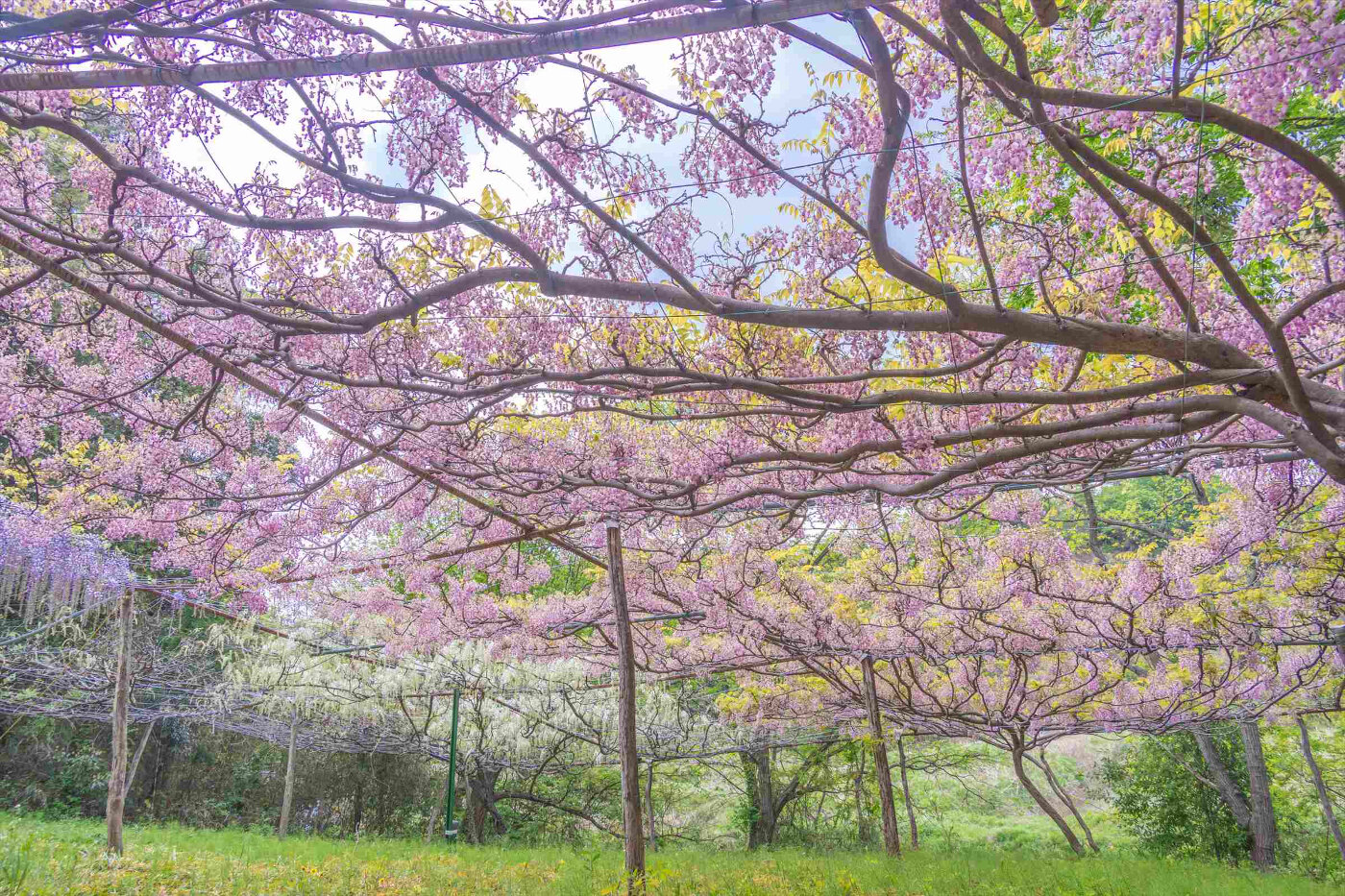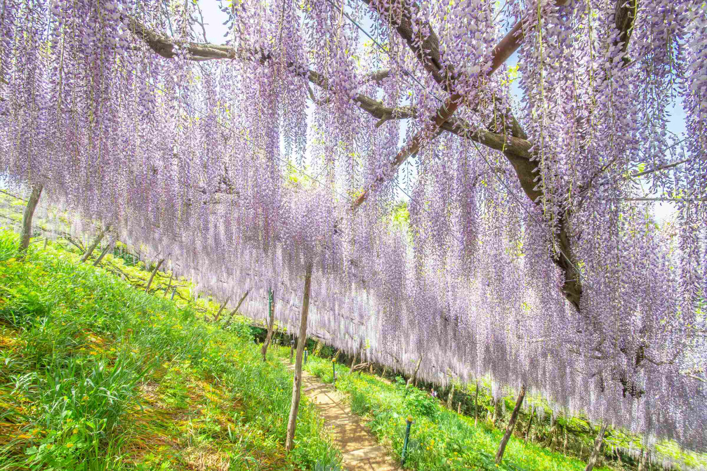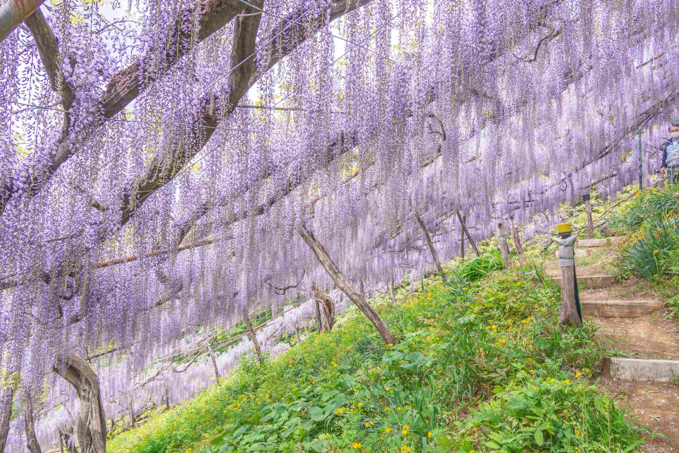 傾斜地にまるでナイアガラの滝のように野性味あふれる藤が咲く藤園です。