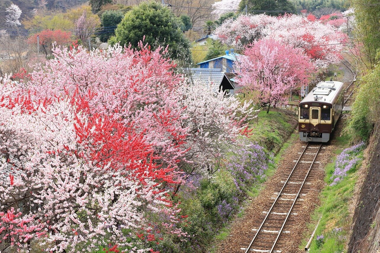 わたらせ渓谷鐵道は、桐生から栃木県間藤(まとう)の山合いを繋ぐ第三セクター鉄道です。神戸駅には、構内に300本の花桃が植えられています。古びた鉄道とあざやかな花桃の景色です。車ではなく、鉄道で訪れたいところです。