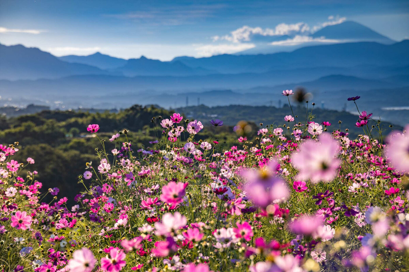 春は菜の花、夏はひまわり、秋はコスモスが楽しめます。近くには蕎麦畑もあります。近年はネモフィラも始めました。