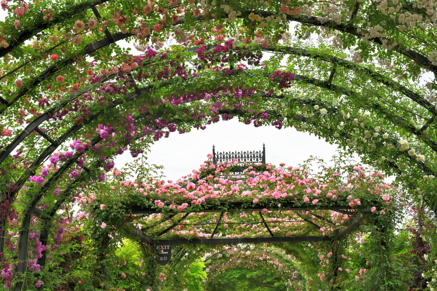 横浜市の花であるバラが2,200種2,800株(春)ある庭園。春バラの季節には「早朝プレミアム開園」も実施されます。十字型のバラのトンネルが有名。