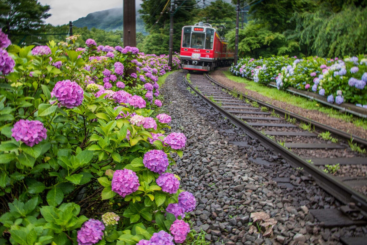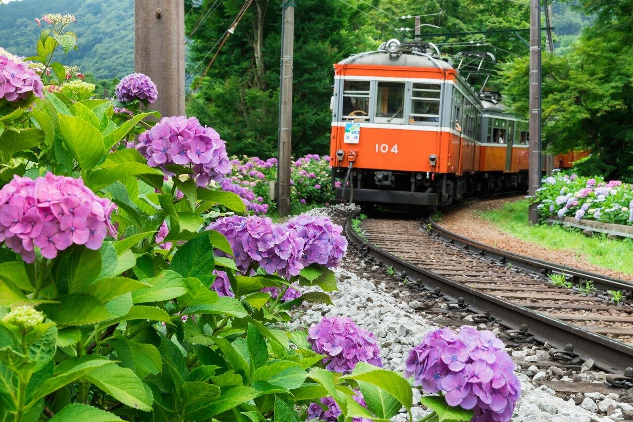 箱根登山鉄道 はこねとざんてつどう 神奈川県 小田原駅から、箱根町、強羅駅(ごうらえき)までは鉄道線で、その上、早雲山駅(そううんざんえき)までは、ケーブルカーで登ります。沿線にアジサイが咲き、あじさい電車で親しまれています。 撮影者 画像検索はこちら Webサイト https://www.hakone-tozan.co.jp/ タグ検索 箱根登山鉄道 アジサイ 鉄道 神奈川県 関東 梅雨 月 6月 都道府県 神奈川県