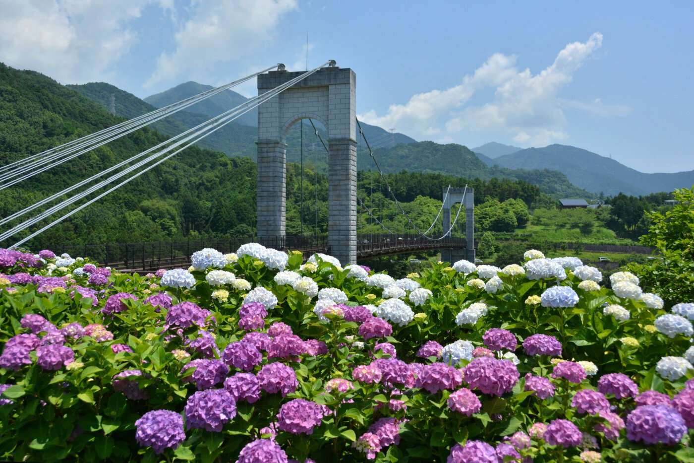 四季折々、いろいろな花が見られる公園です。紫陽花の時期は、「風の吊り橋」とのコラボショットが人気。