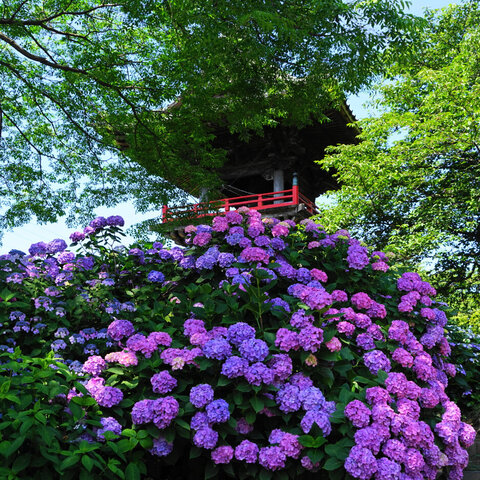 妻沼の「あじさい寺」と呼ばれるお寺。境内に50種類800株をこえるあじさいが咲き、鐘楼を背景にした紫陽...
