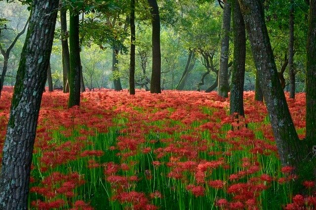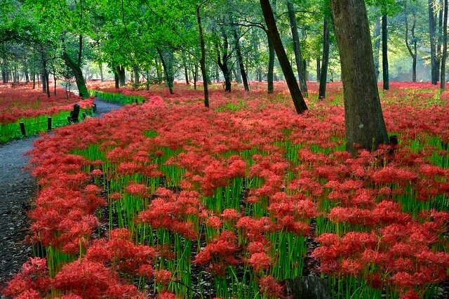 日高市を流れる高麗川により、長い年月をかけて作られた平地で、日和山から眺めると、巾着の形に似ていることから「巾着田」と名付けられました。直径約 500m、約 22haの平地の約 3.4ha に彼岸花の群生地が現れます。約 500 万本の彼岸花は、日本最大級になります。9 月中旬から 10 月上旬にかけて「巾着田曼珠沙華まつり」が開催され、市内のグルメの飲食店や物産店の出店が並びます。