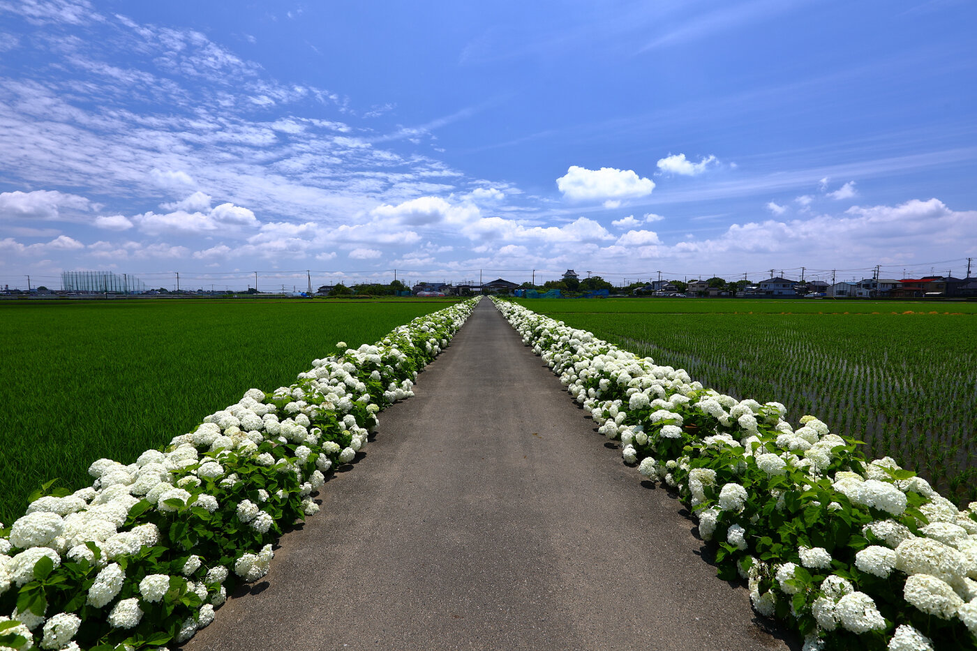 埼玉県加須市の玉敷公園、騎西総合公園、騎西文化・学習センター(キャッスルきさい)の約1,500mの遊歩道に、約10,000株のアジサイが咲きます。