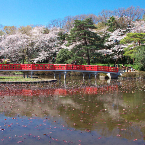 園内には600本の桜がある名所。池に架かる赤い橋がフォトジェニックな公園。