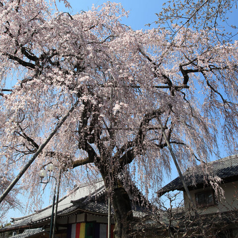 境内に樹齢150年のしだれ桜があるお寺。裏手斜面ではカタクリも見ることができます。