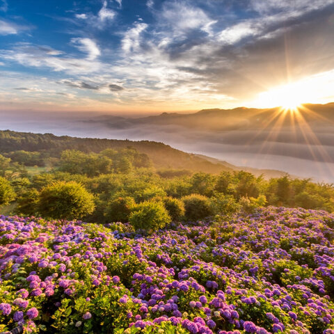 標高約 580mの蓑山山頂に広がる美の山公園には、約 3,500 本のあじさいが山の斜面を埋めるように咲きま...