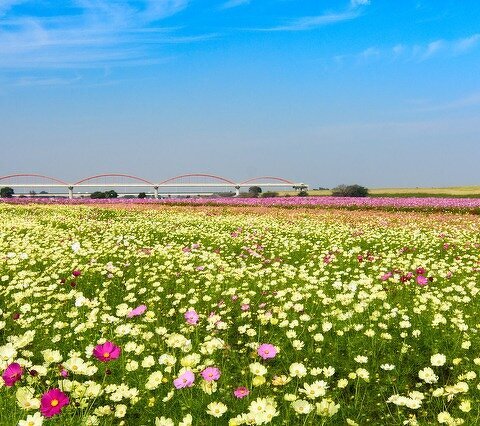 荒川の河川敷に広がる関東最大級の花畑。早春には菜の花、春はポピー、秋はコスモスになります。水管橋...