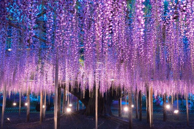 紫色の藤だけでなく、白藤や黄花藤などの様々な藤が楽しめるフラワーパーク。同時期に咲く躑躅との共演も美しい。シンボルでもある樹齢160年と言われる大藤は、当時の樹齢約130年の頃に都市開発のために移植されてきたもの。場所を変えても見事に咲き続ける生命力にも心を打たれます。