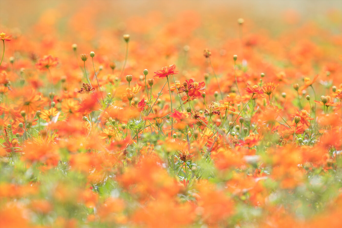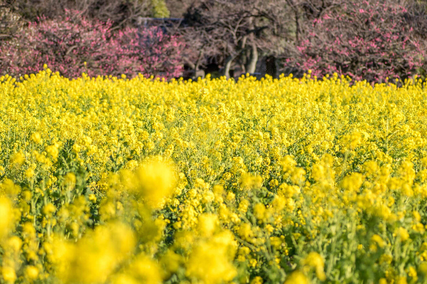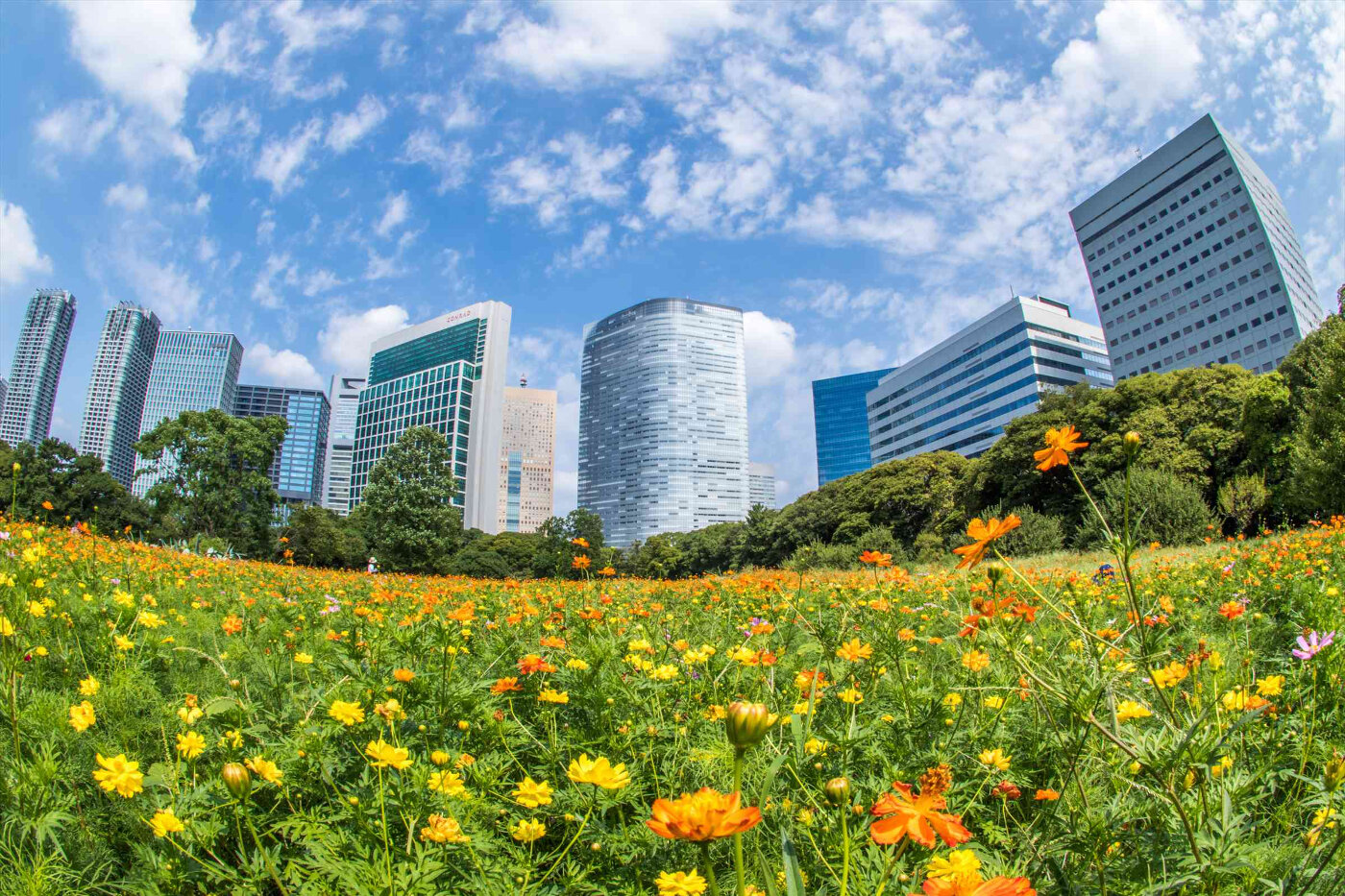 菜の花畑やキバナコスモス畑と高層ビル群が妙にマッチした景色が特徴。梅や紅葉も楽しめます。