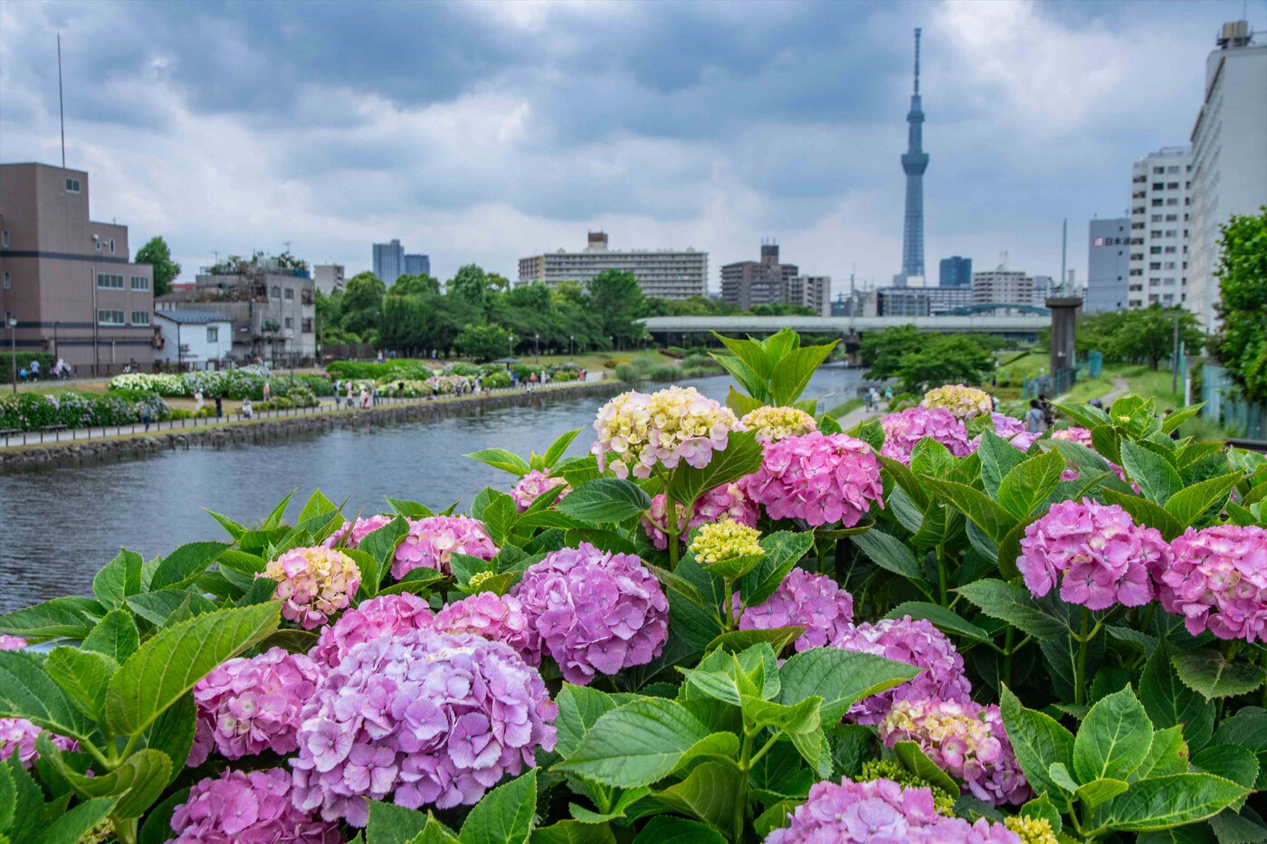 旧中川水辺公園はあじさいとスカイツリーのコラボで有名。江東区立旧中川水辺公園外3施設を合わせて愛称「江東旧中川水彩パーク」と呼称しているようです。あじさいはふれあい橋からスカイツリー寄りに多く植栽されています。旧中川沿いは、桜も美しいです。墨田区立旧中川水辺公園もあるようで混乱しがちです。