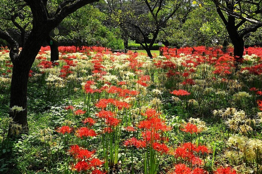 太宰府天満宮から贈られた梅を含め120種約1,300本の梅が咲きます。120株からなる30mの萩のトンネル、あじさいは1万株、その他マンサクやフクジュソウなど早春の花々も楽しめます。彼岸花は8,000株と云われていましたが、近年大量の球根を植え、35万株に増加した模様です。